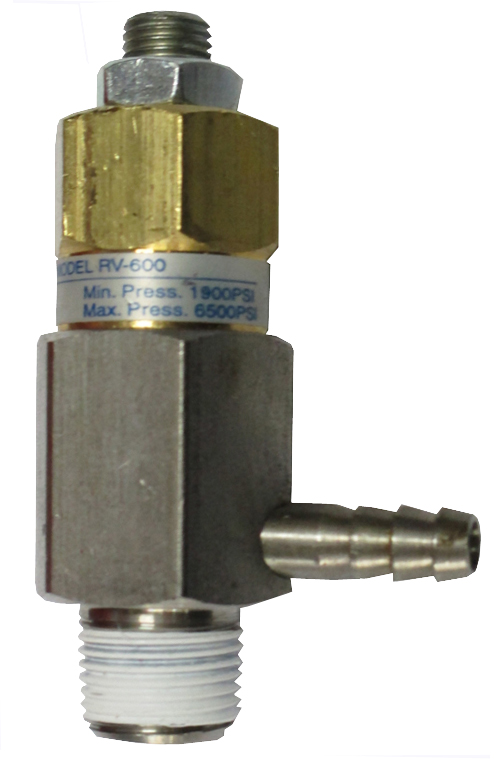 VALVE,RELIEF-STAINLESS STEEL BODY W/BRASS HEAD,1900PSI:6500PSI,5/16"-3/8"HOSE BARB,3/8" MALE INLET,12GPM,#RV-600-2